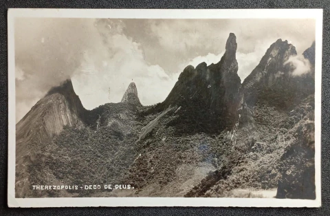 Cartão postal com imagem do `Dedo de Deus` em Therezópolis. Linda fotografia de época em preto e bra